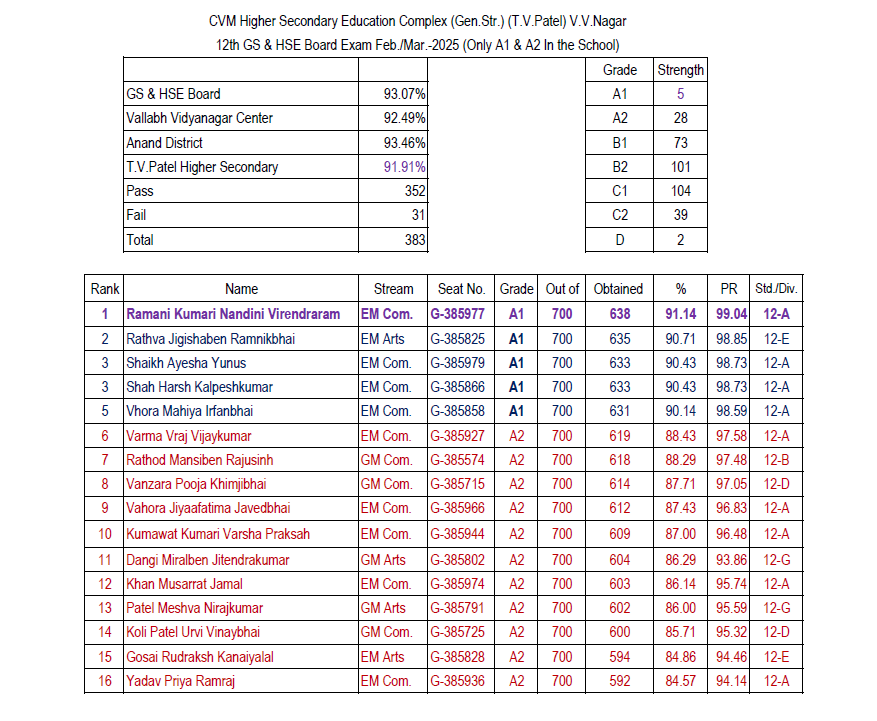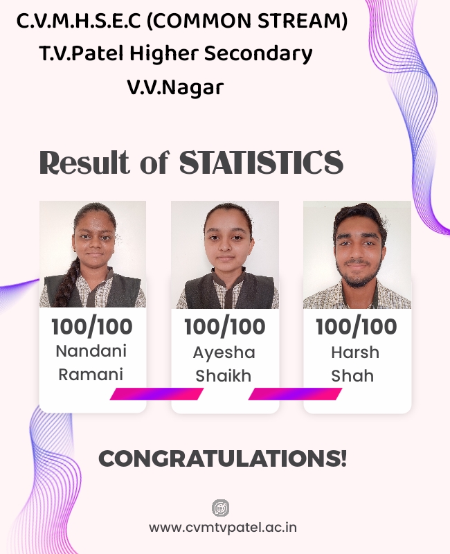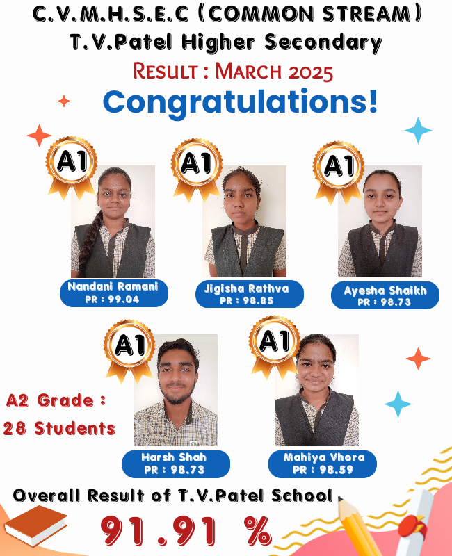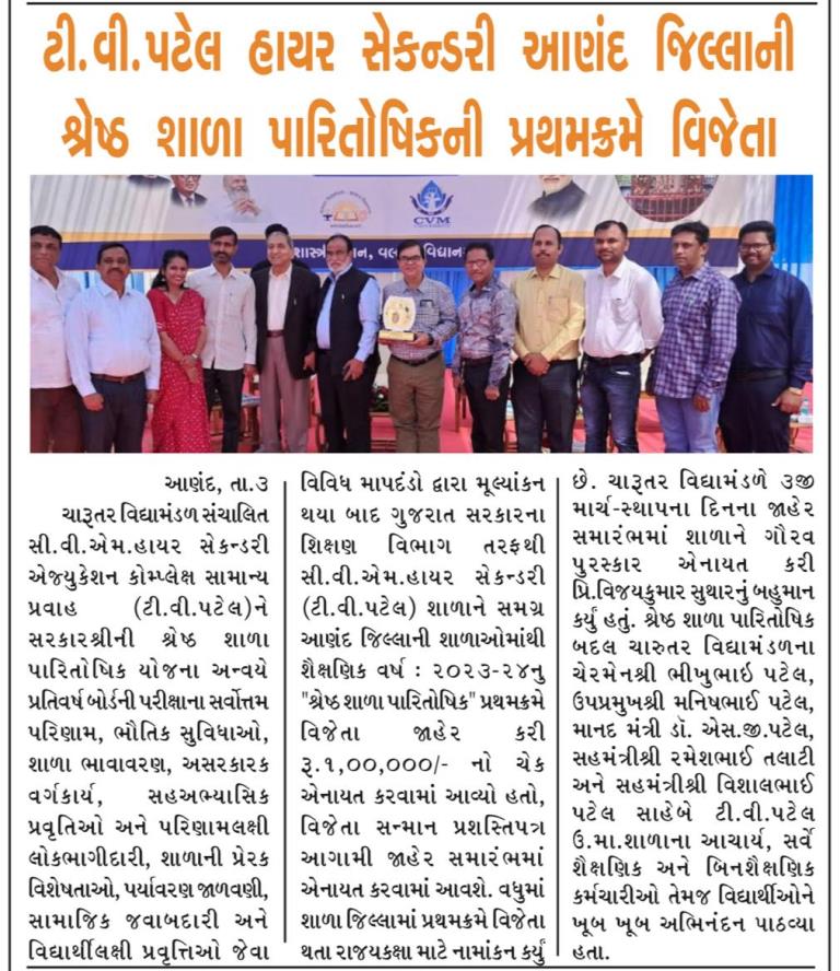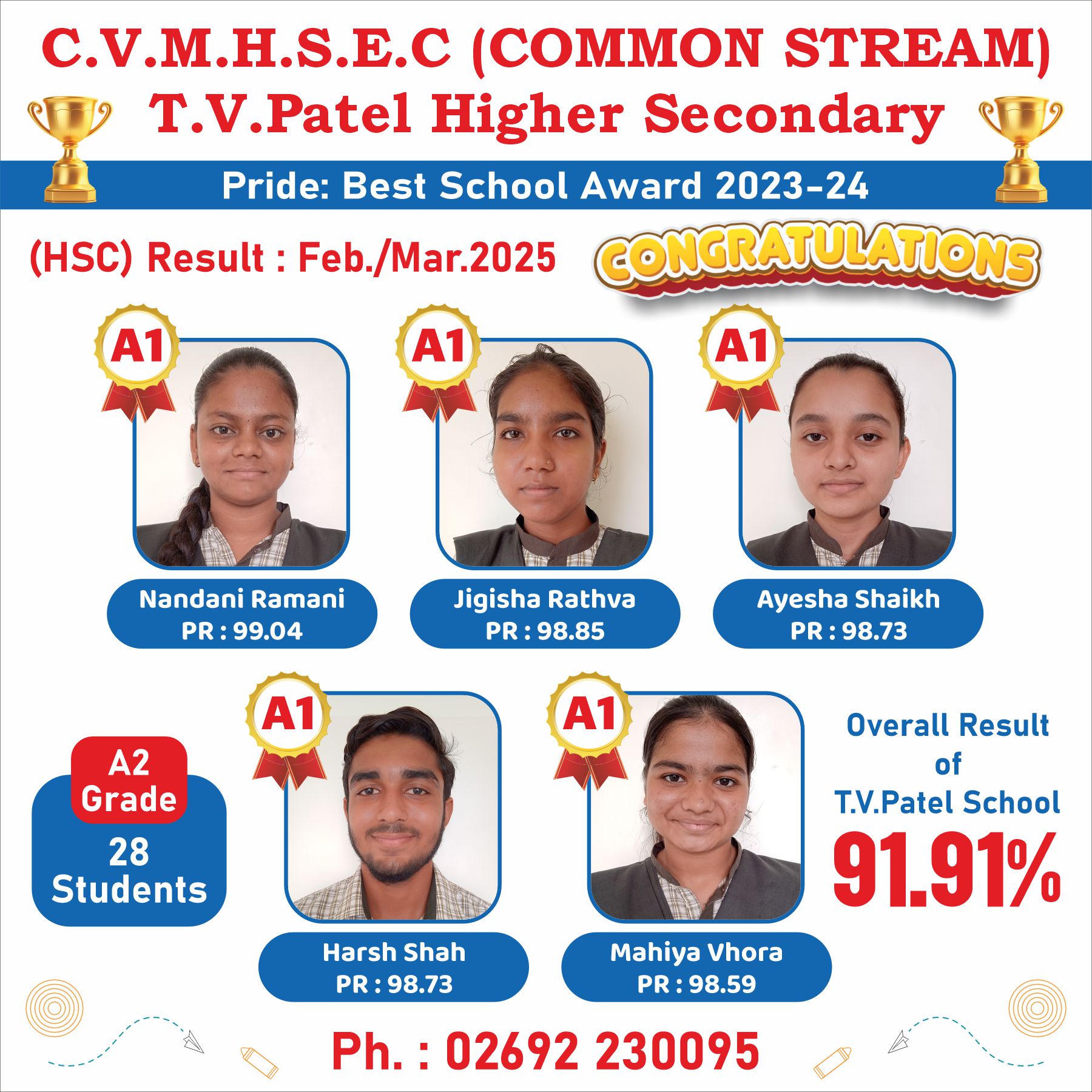 Housed in the building of T. V. Patel Arts College the coeducational Charutar Vidyamandal Higher Secondary Education Complex (Common Stream) was started in June-1976. The following subjects are taught in Gujarati and English medium (General Stream: Commerce & Arts) in 11th and 12th standards: